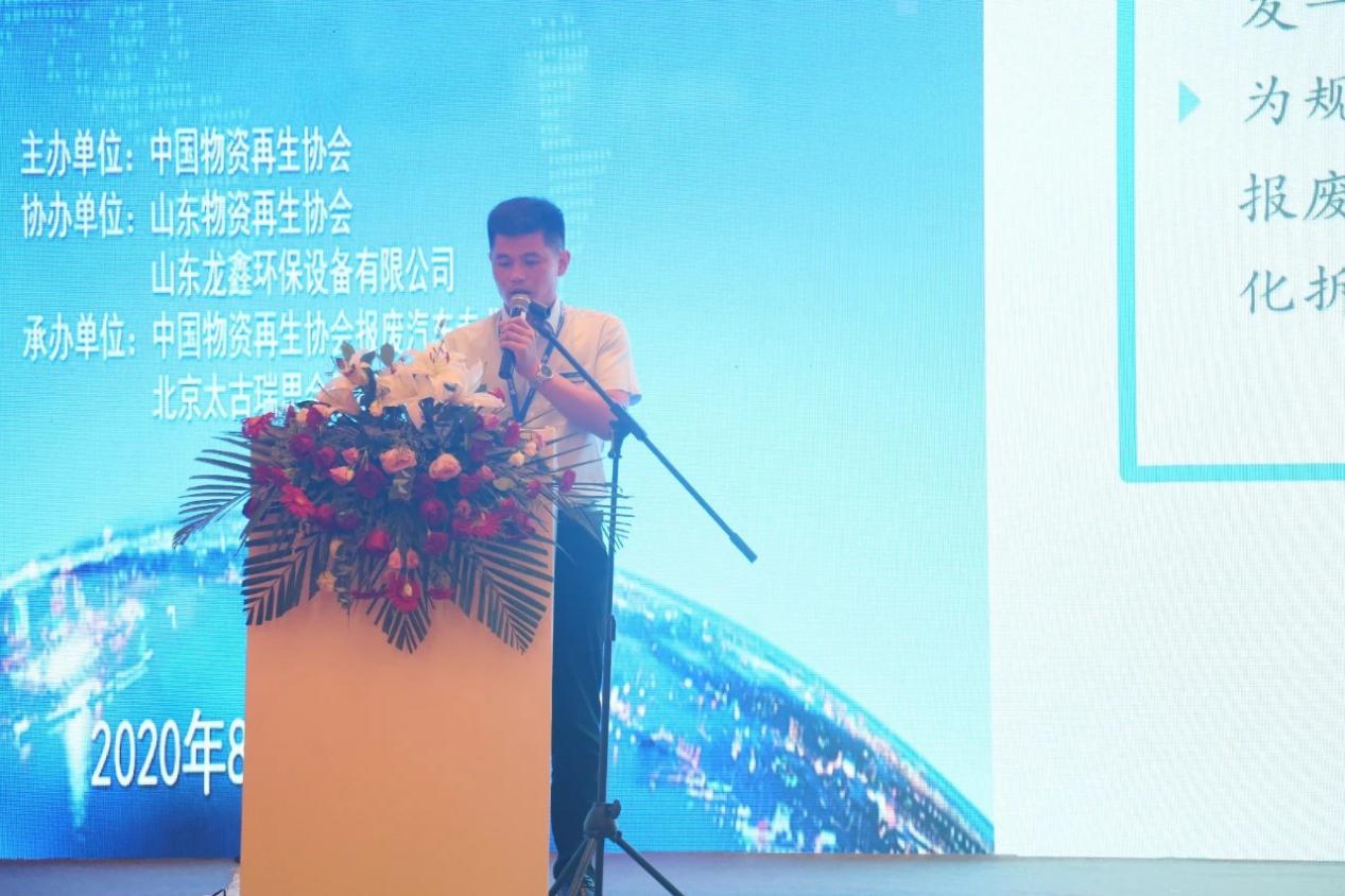 本次大會協辦單位山東龍鑫環保設備有限公司總經理楊洪杰演講《機械化拆解是報廢機動車回收行業發展的必由之路》報告,向參會的各位領導及代表闡述了推動報廢機動車行業無害化、資源化發展,機械化拆解是行業發展的必然趨勢的綠色發展理念。通過山東龍鑫報廢汽車拆解線案例,展示了機械化拆解的優勢。